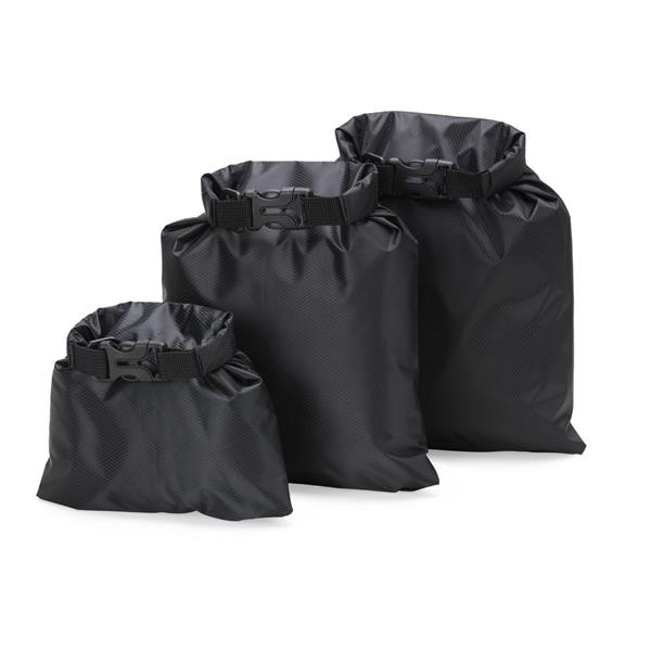 Kit com 3 sacos em nylon impermeável com fechamento por fivelas. Gravação da logomarca em 1 cor já inclusa.