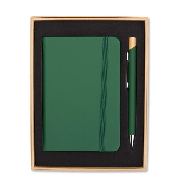 Kit executivo composto por uma caderneta e uma caneta. A caderneta possui capa dura em couro sintético, marca-páginas em fita de cetim e elástico para fechamento, além de aproximadamente 80 folhas com pauta. Por sua vez, a caneta metálica conta com detalhe em bambu, acionamento por clique e carga esferográfica azul de 1,0mm. Acompanha uma caixa de papelão com berço interno em espuma. Gravação da logomarca em 1 cor já inclusa.