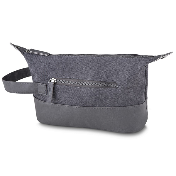 Nécessaire com detalhes em couro sintético, tecido poliéster 600D,alça de mão, bolso externo, botões laterais extensor, gravação Frontal. Gravação da logomarca em 1 cor já inclusa.